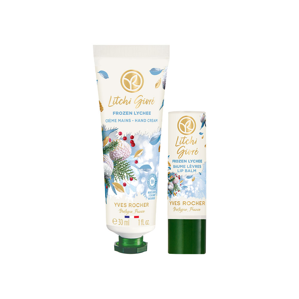 Este kit; contiene: 1 MINI CREMA PARA MANOS LICHI ESCARCHADO 30 ml 1 BALSAMO LABIAL LICHI ESCARCHADO 4.8 g