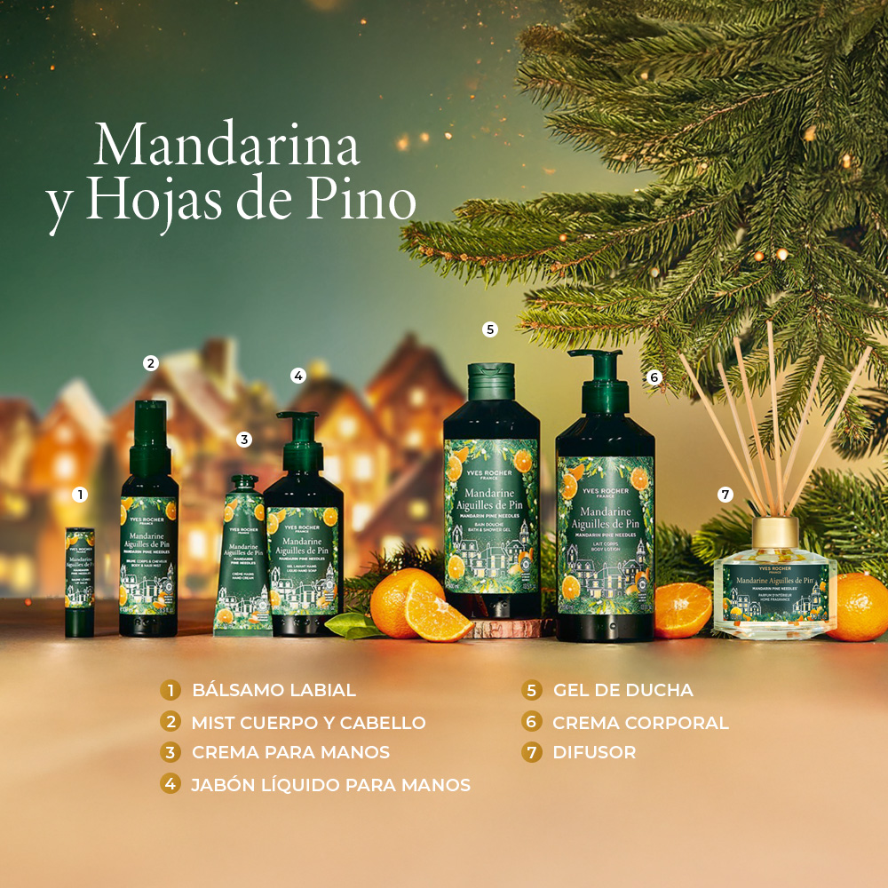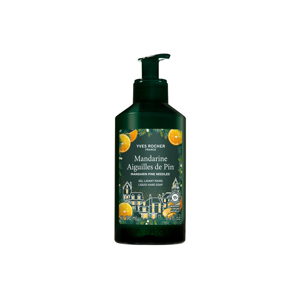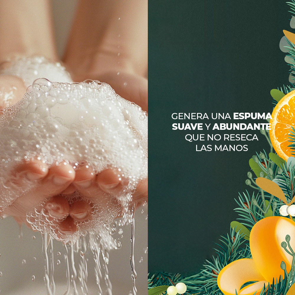 Jabón Líquido para Manos Mandarina y Hojas de Pino; limpia y perfuma tus manos sin resecarlas, respetando su hidratación natural.