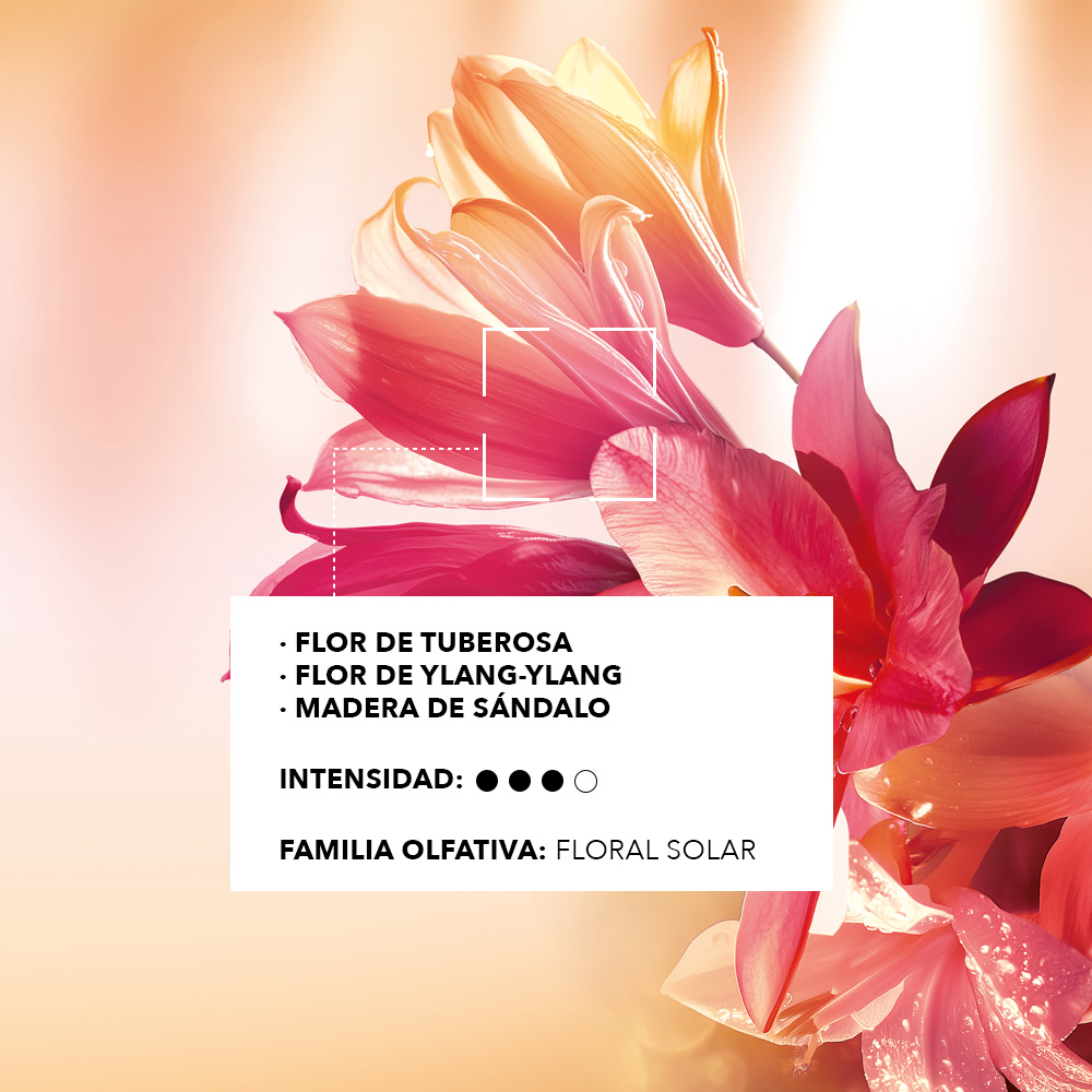 Familia Olfativa: Floral Intensidad: +++ Notas: Flor de Tuberosa, Flor de Ylang-Ylang y Madera de Sándalo.