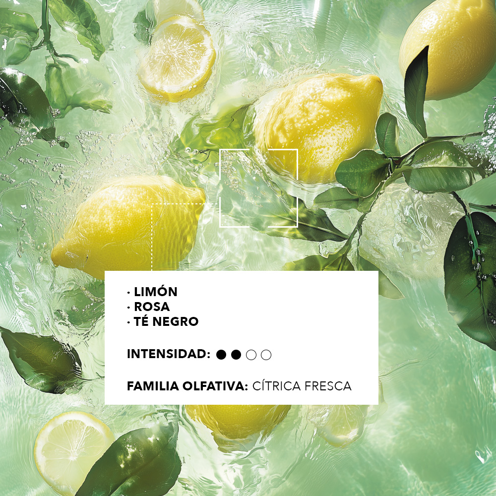 Familia Olfativa: Cítrico Fresco Intensidad: ++ Notas: Limón, Rosa y Té Negro