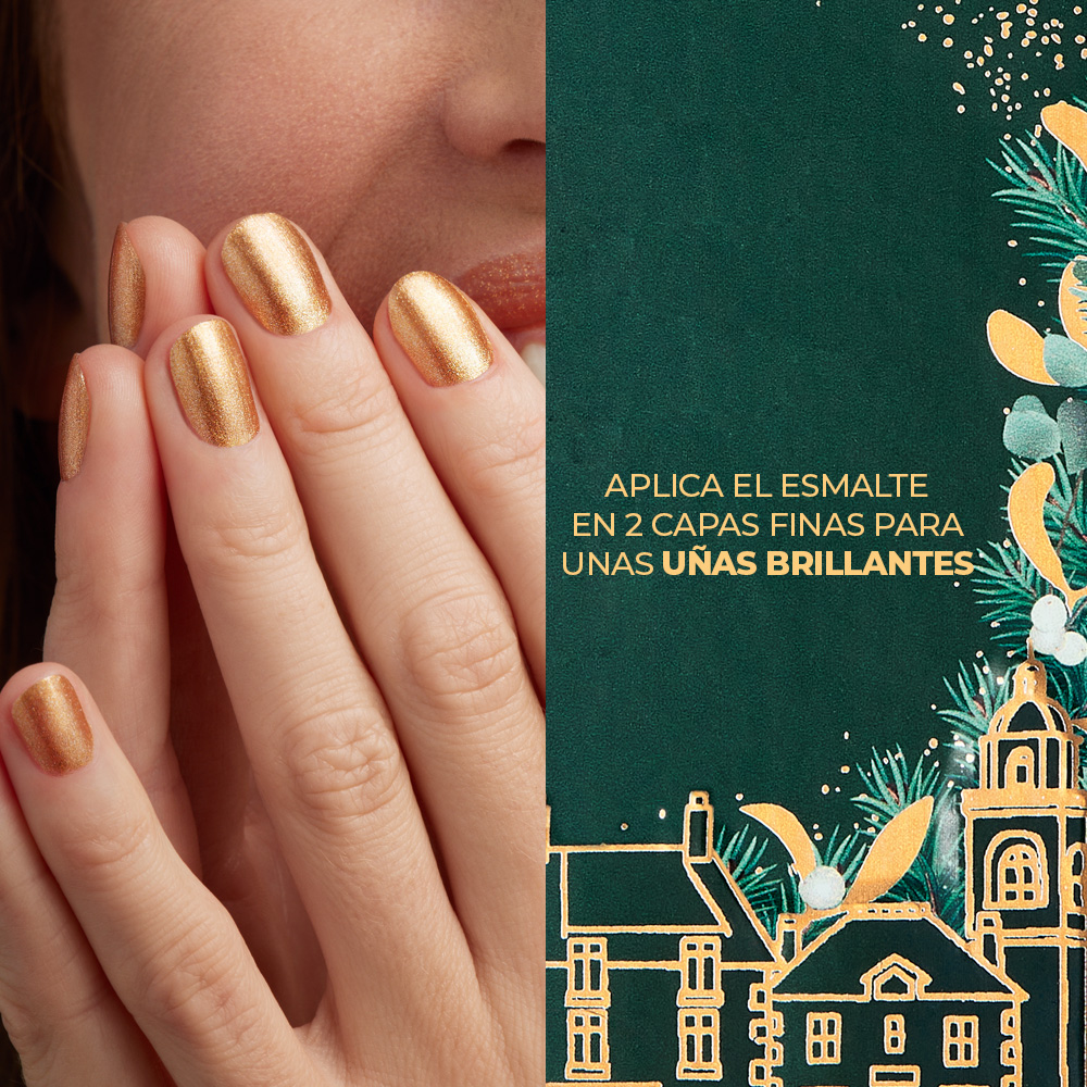Esmalte con Glitter; formulado con ingredientes naturales y un irresistible brillo dorado, garantiza una